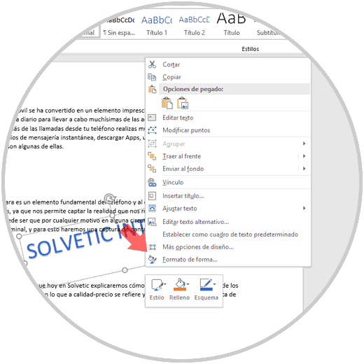 Damos clic derecho sobre el WordArt y seleccionamos Formato de forma: