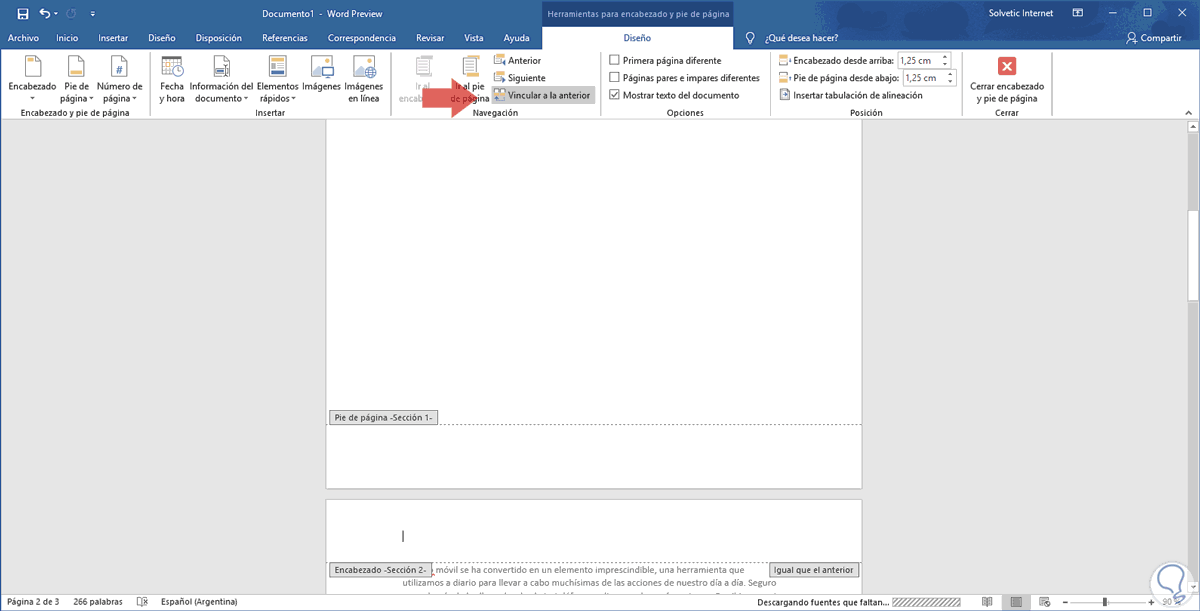 Como vemos, ahora contamos con un nuevo menú llamado Herramientas para encabezado y pie de página, debemos ir a la pestaña Diseño y dar clic en la opción Vincular al anterior: