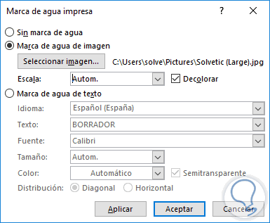Allí simplemente activamos la casilla Sin marca de agua y pulsamos en Aplicar / Aceptar para remover la marca de agua de Word 2019.