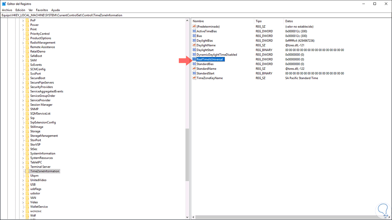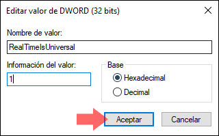 Este nuevo valor DWORD será llamado RealTimeIsUniversal: