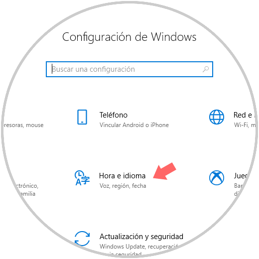 Para hacer uso de esta primera opción, debemos ir al menú "Inicio" y allí pulsar en la utilidad "Configuración" donde veremos lo siguiente. Seleccionamos la categoría "Hora e idioma".