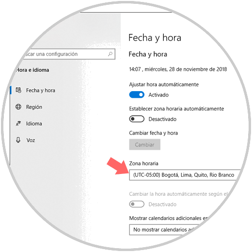 En la nueva ventana vamos a la sección "Fecha y hora" donde veremos lo siguiente. En el campo "Zona horaria" debemos validar que el formato establecido sea el de nuestra ubicación geográfica. De no ser así, podemos pulsar en la flecha desplegable y seleccionar la opción correcta, de forma alterna podemos ingresar otra zona horaria y luego de un corto tiempo ingresar de nuevo la zona correcta.