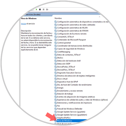 Como hemos mencionado, la hora en Windows 10 es un servicio llamado "Hora de Windows", el cual tiene como misión llevar a cabo la sincronización de fecha y hora en el equipo. Si este servicio falla o no ha sido iniciado, esto tendrá un impacto negativo en la sincronización y con ello se desplegará la hora incorrecta.