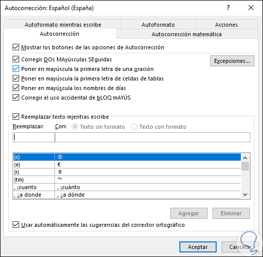 Otro método para insertar los símbolos de Copyright, derechos de autor, y Marca registrada en Microsoft Word es usando nuestro teclado ya que ambos símbolos están incluidos de forma predeterminada en la configuración de Autocorrección de Word 2019 o 2016.
