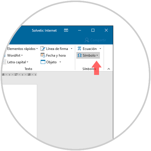Para dar inicio a este proceso, vamos al menú “Insertar” y allí, en el grupo “Símbolos”, daremos clic en la opción “Símbolo”: