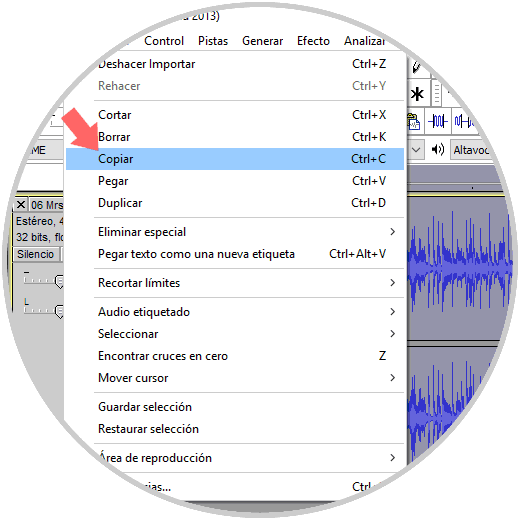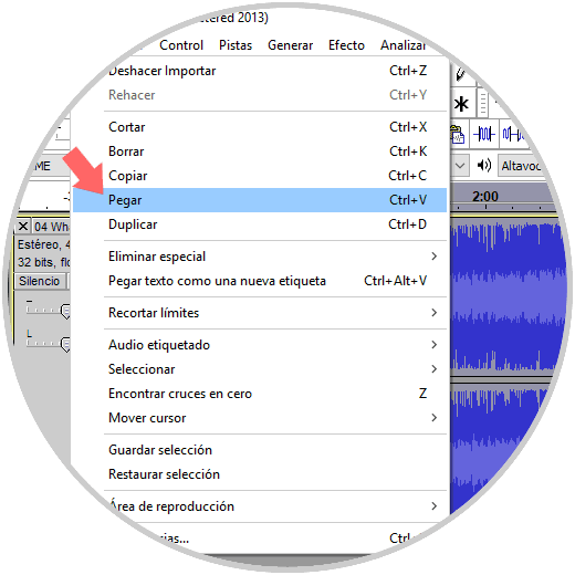 Iremos a la primera pista y en el menú Editar seleccionamos Pegar: