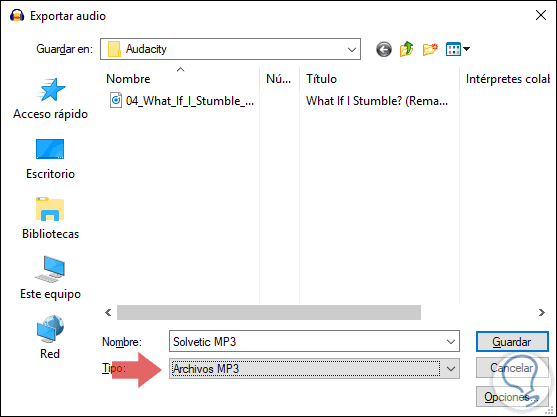 En la ventana emergente seleccionamos Archivo MP3 en el campo Tipo y asignamos un nombre. Pulsamos en Guardar y ahora este archivo combinado estará listo para ser añadido en PowerPoint usando el método inicial.