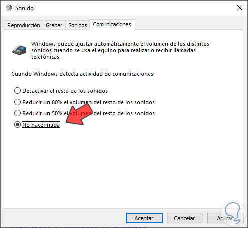 Ahora entramos en el panel de "Comunicaciones" y elegiremos la opción de "No hacer nada" para evitar que se reduzca el volumen de sonido cuando hacemos alguna comunicación.