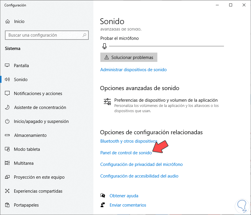 Aquí dentro de la categoría de "Sonido" de la izquierda, en la parte derecha elegiremos "Panel de control de sonido"