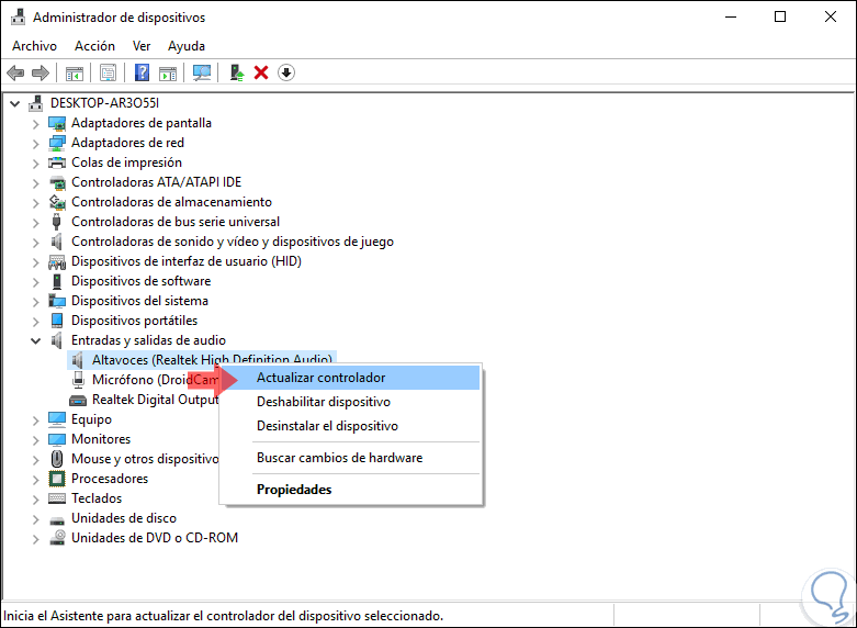 Para su actualización vamos de nuevo al administrador de dispositivos y allí damos clic sobre nuestro controlador y seleccionamos la opción "Actualizar controlador":