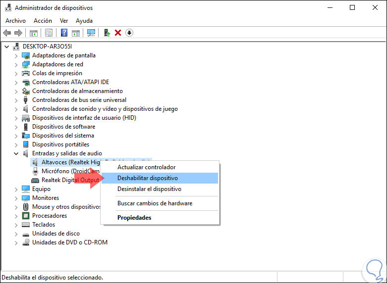 En la ventana desplegada vamos a la sección "Entradas y salidas de audio" y allí daremos clic derecho sobre nuestro controlador donde seleccionaremos la opción "Deshabilitar dispositivo".