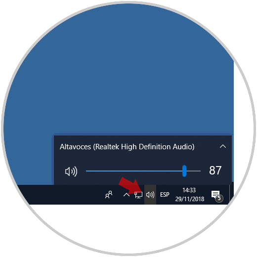 Debemos dar clic en el icono "Altavoces" en la barra de tareas y allí será desplegado nuestro dispositivo de audio y su nivel de volumen actual: