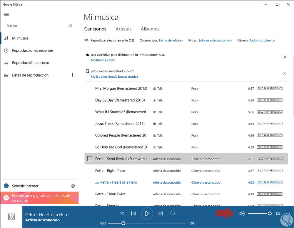 En caso de usar aplicaciones de terceros para la reproducción de los elementos de audio, o usando una integrada en Windows 10 como Groove, podemos visualizar el nivel de volumen en la parte inferior ya que estas aplicaciones administran el volumen de forma independiente al sistema: