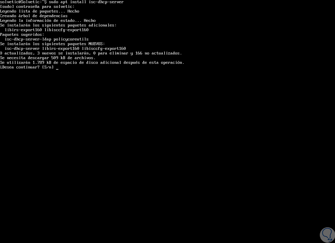 Ingresamos la letra "y" para confirmar la descarga e instalación de DHCP.