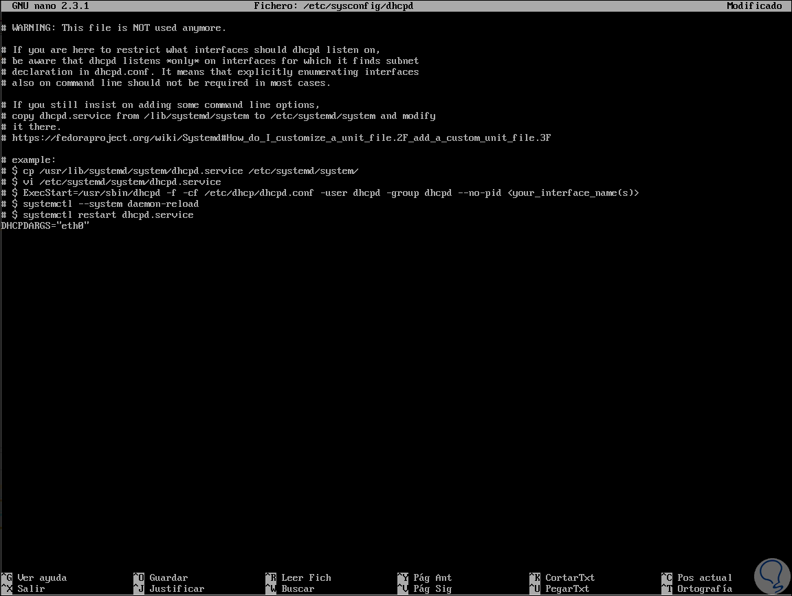 DHCPDARGS=”eth0”Guardamos los cambios con las teclas: