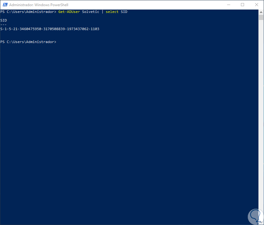 Para este proceso usaremos el cmdlet Get-ADUser ya que trabajamos en un entorno de dominio, y usaremos la siguiente sintaxis para identificar el SID: