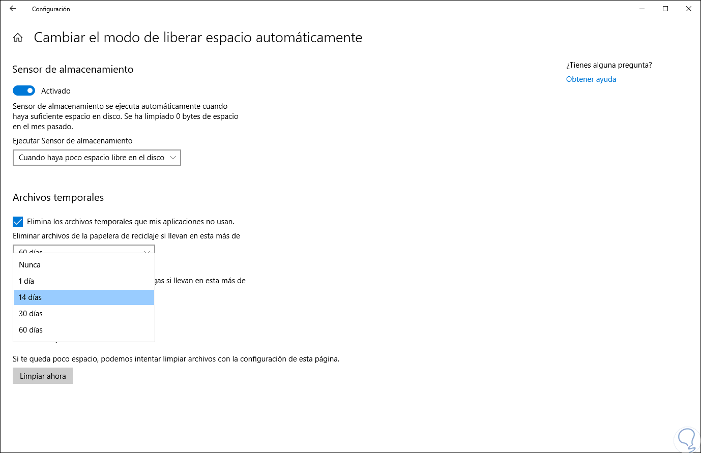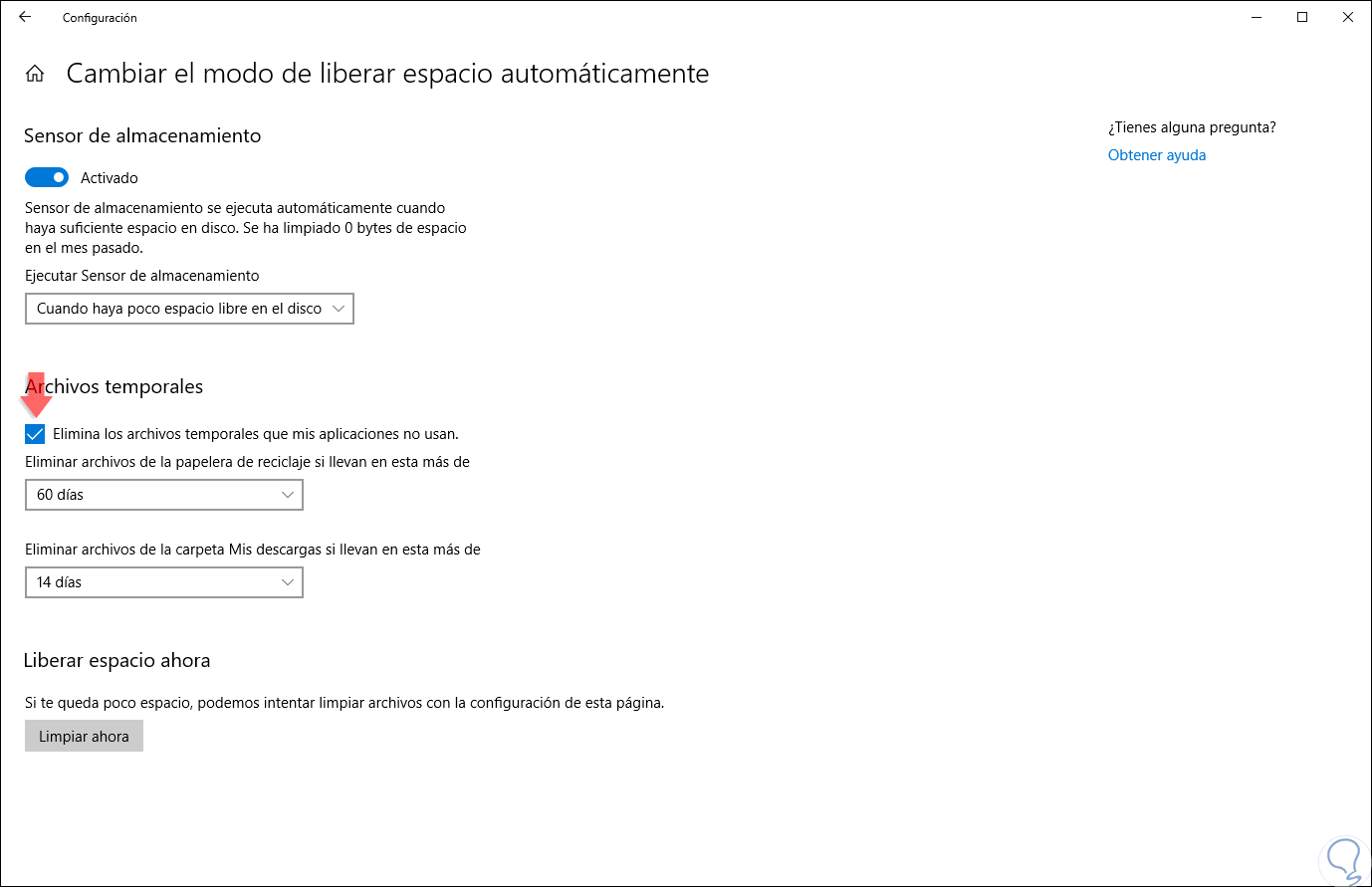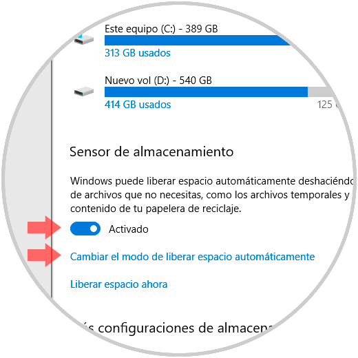 Allí damos clic en la línea “Cambiar el modo de liberar espacio automáticamente” y seremos redireccionados a la siguiente ventana: