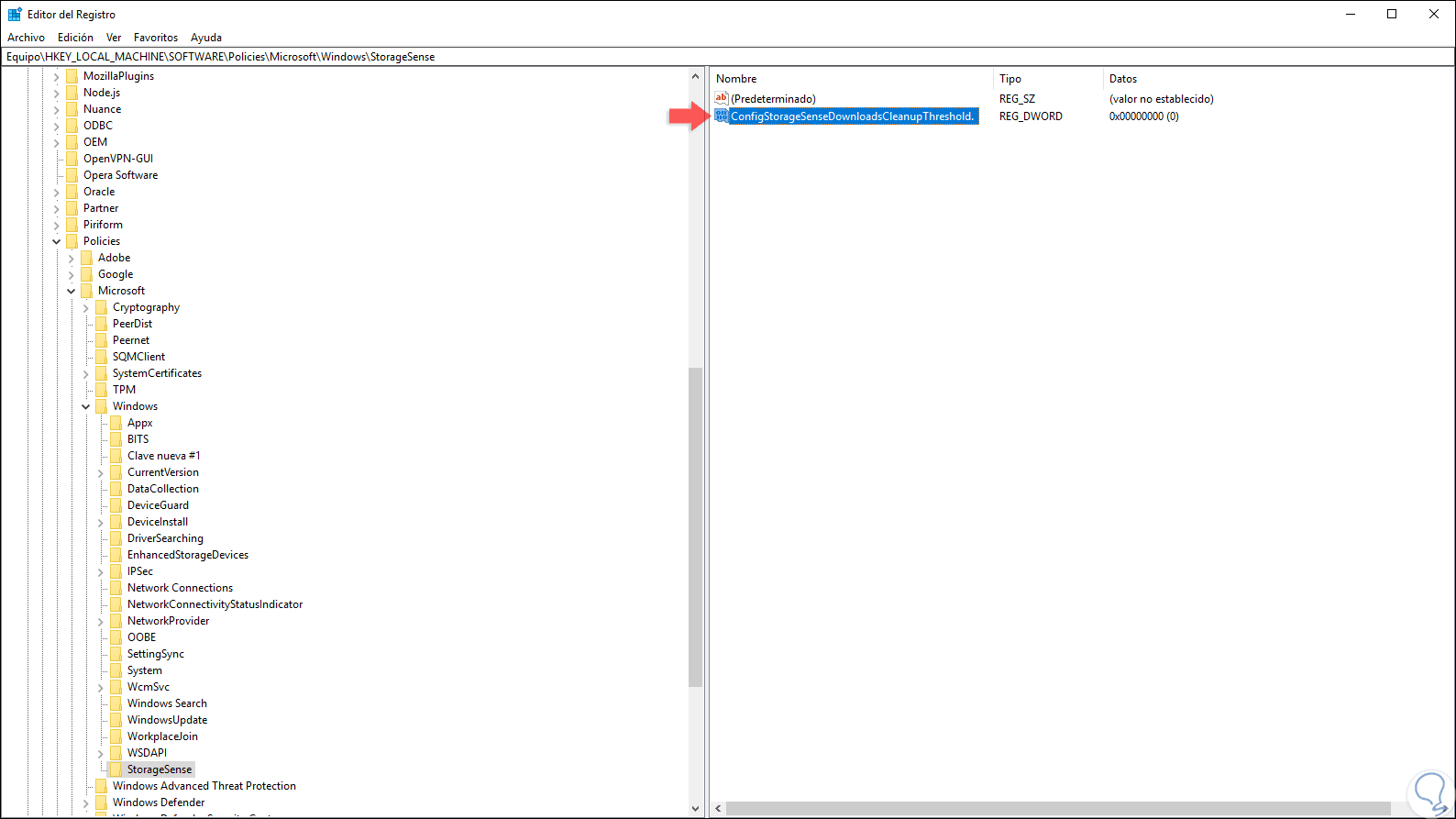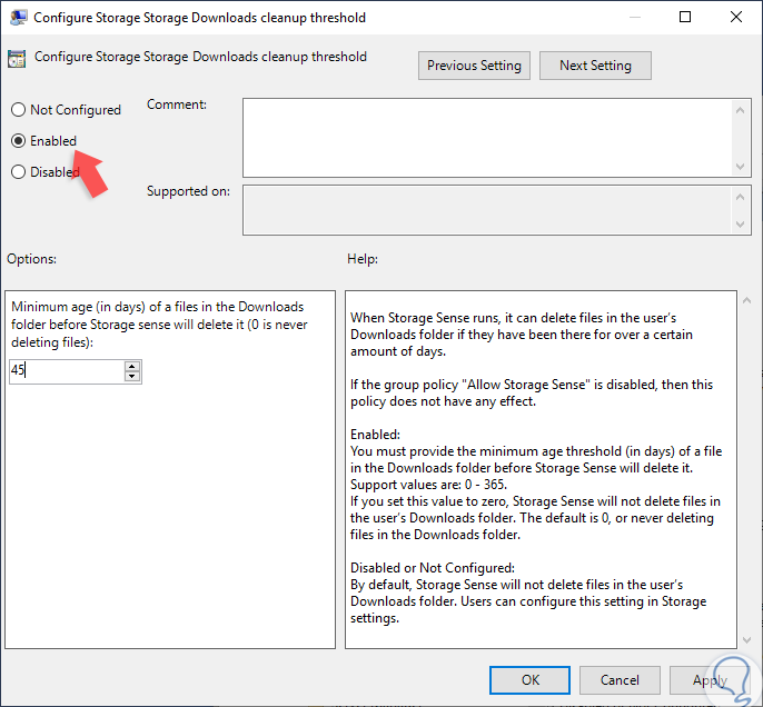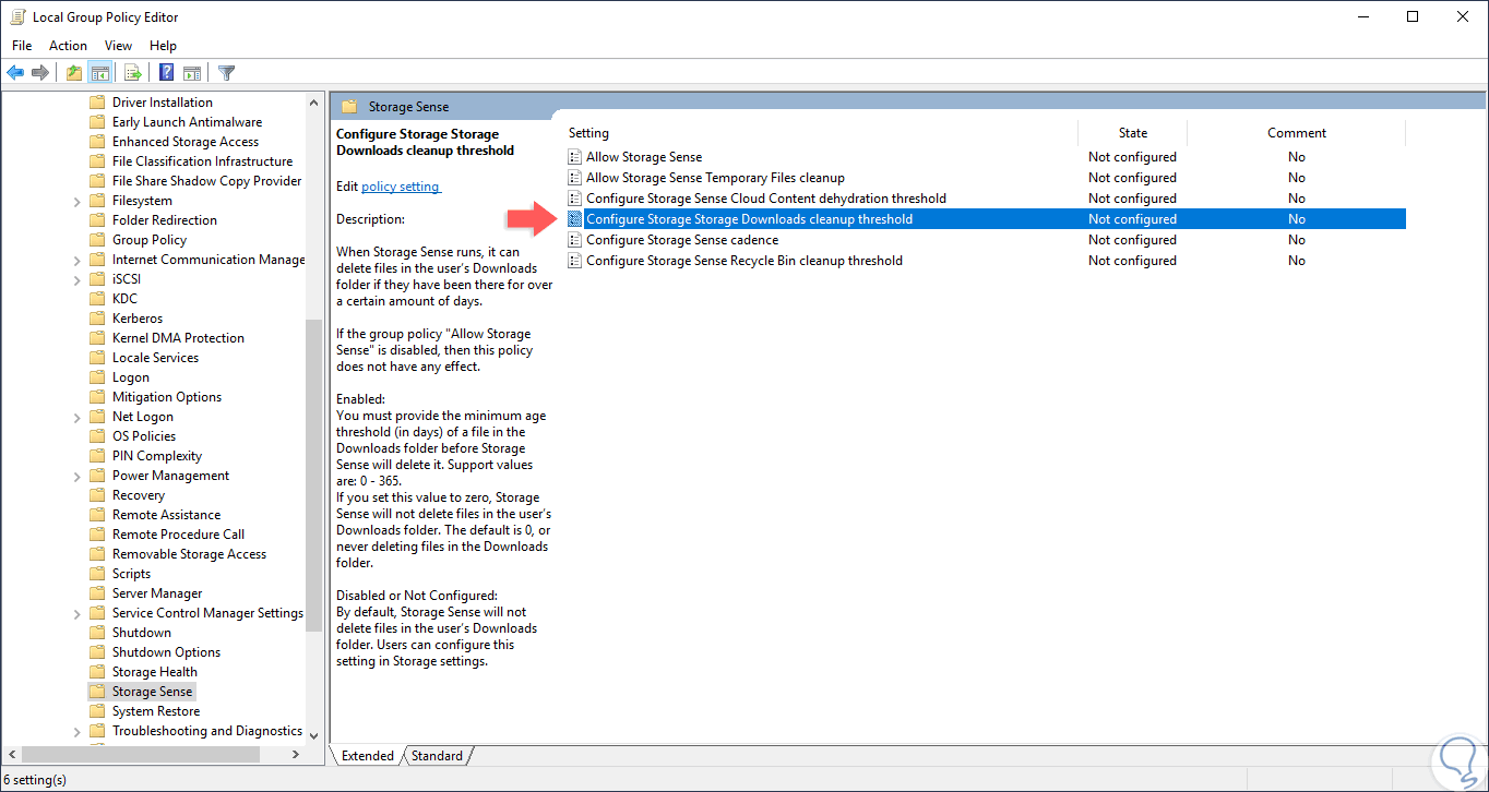 Allí ubicamos la sección “Storage Sense” y en el panel central ubicamos la política llamada “Configure Storage Downloads cleanup threshold”: