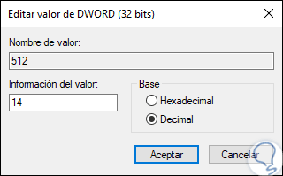 Ahora, damos doble clic sobre el valor DWORD 512 y este valor se encarga de determinar el rango de tiempo, allí ingresamos el número 1, 10, 30 o 60 en decimal para el número de días deseado en el cual se han de eliminar los elementos de la carpeta Descargas: