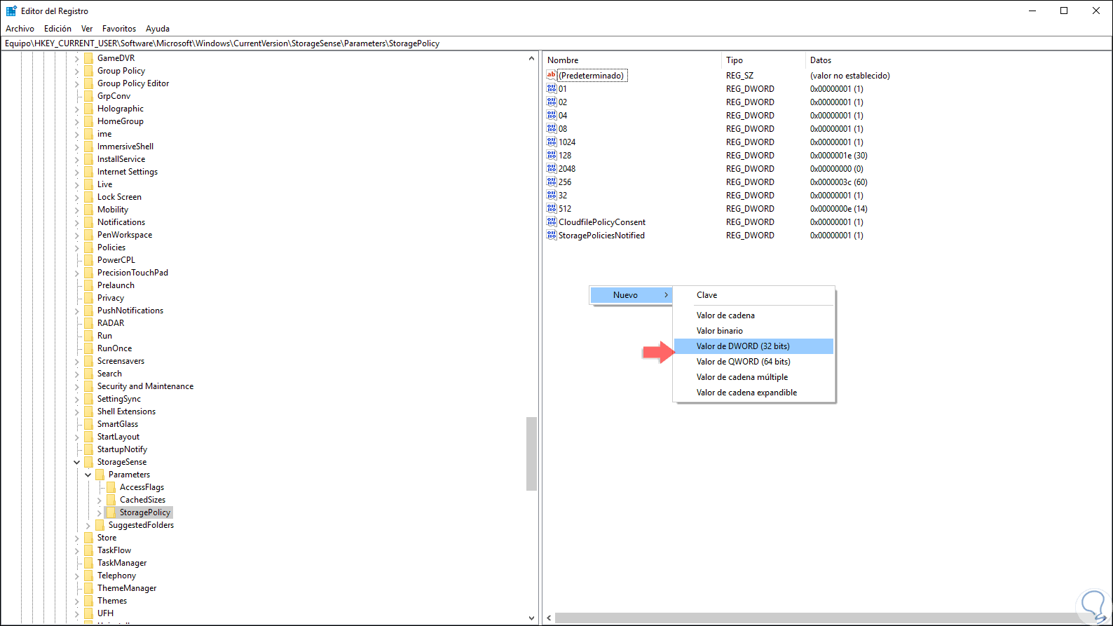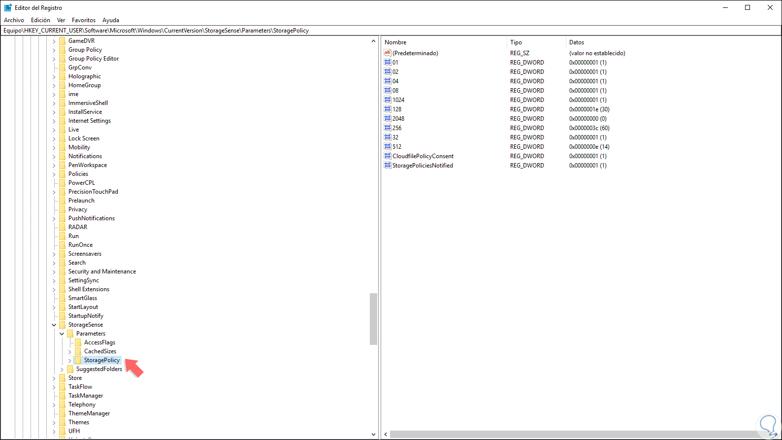 HKEY_CURRENT_USER\Software\Microsoft\Windows\CurrentVersion\StorageSense\Parameters\StoragePolicy