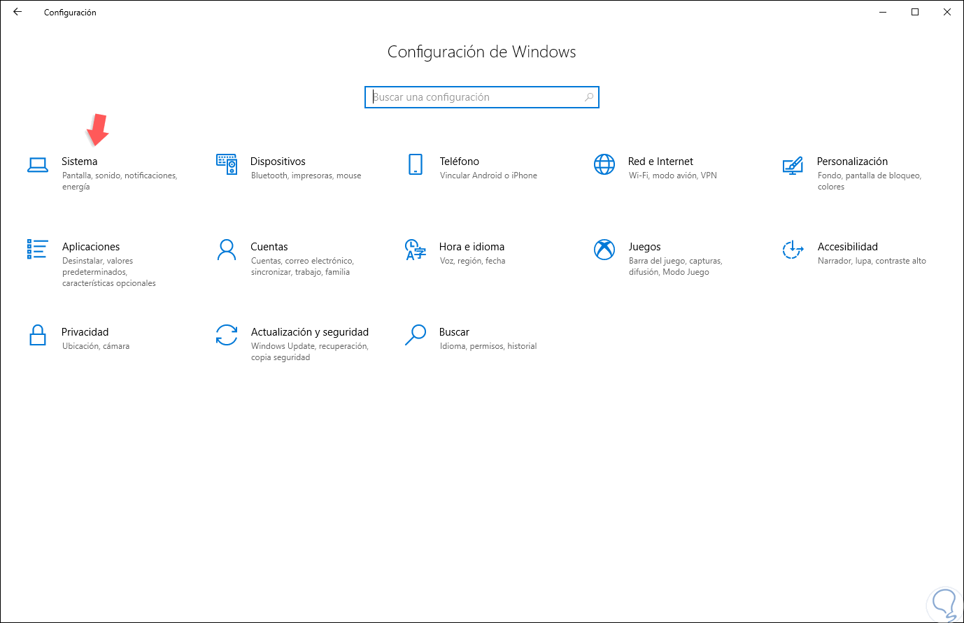 Para acceder a este sensor iremos al menú Inicio y allí seleccionamos la utilidad Configuración donde veremos lo siguiente: