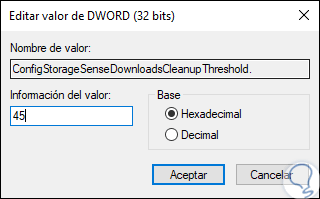 Damos doble clic sobre el valor DWORD llamado “ConfigStorageSenseDownloadsCleanupThreshold” y en la ventana desplegada establecemos un valor entre 0 y 365 en formato decimal: