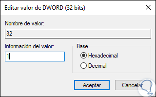 En primer lugar, daremos doble clic sobre el valor DWORD 32 y en el campo “Información del valor” establecemos el número 1 para habilitar la función de la limpieza automática para la carpeta Descargas, si deseamos deshabilitarla debemos usar el valor de 0. Pulsamos en Aceptar para aplicar los cambios.