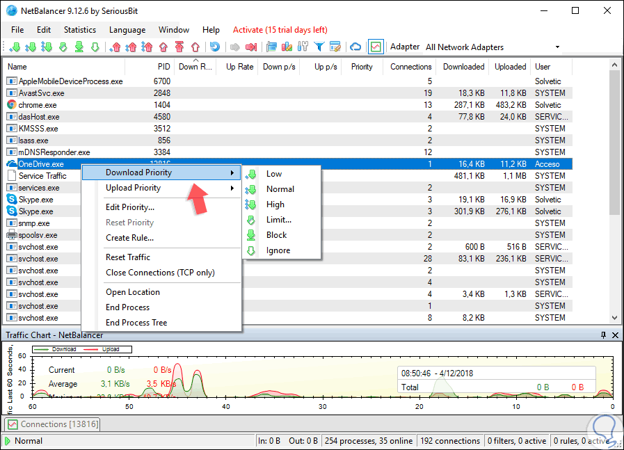 Podemos dar clic en la columna Download Rate para ordenar todos los procesos según la cantidad de ancho de banda usada. Una vez detectemos el proceso a editar, daremos clic derecho sobre él y en la línea “Download priority” seleccionamos opciones como low, normal o high priority:
