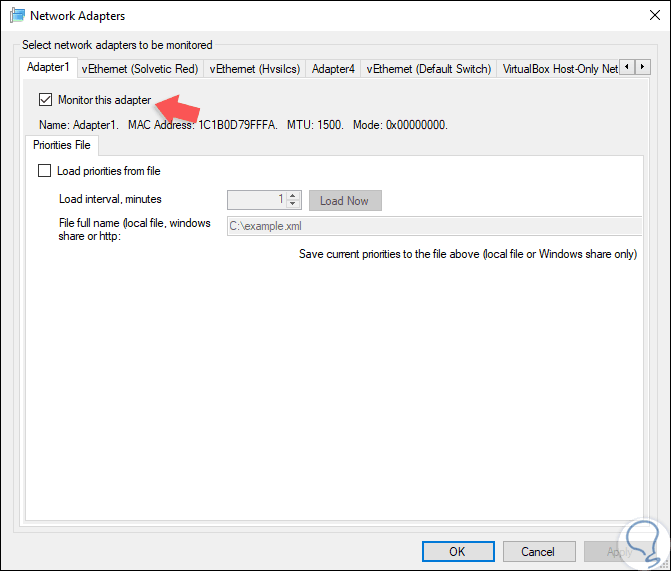 En la ventana que será desplegada, vamos a las pestañas de cada adaptador a revisar y allí activar la casilla “Monitor this adapter”: