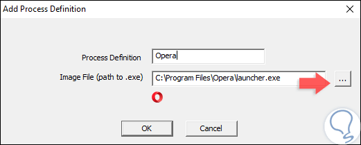 Se desplegará la siguiente ventana donde ingresaremos un nombre al proceso, así como la ruta del ejecutable de la misma: