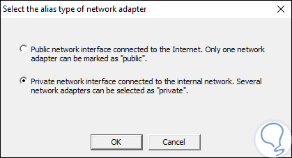 Al seleccionar la interfaz, veremos un mensaje indicando que debemos seleccionar un tipo de red, en caso de contar con enrutador en la red personal, seleccionamos la opción "Private", pero si estamos conectados directamente a Internet o en una red Wi-Fi pública, seleccionamos la opción "Public". Pulsamos en Ok para confirmar.