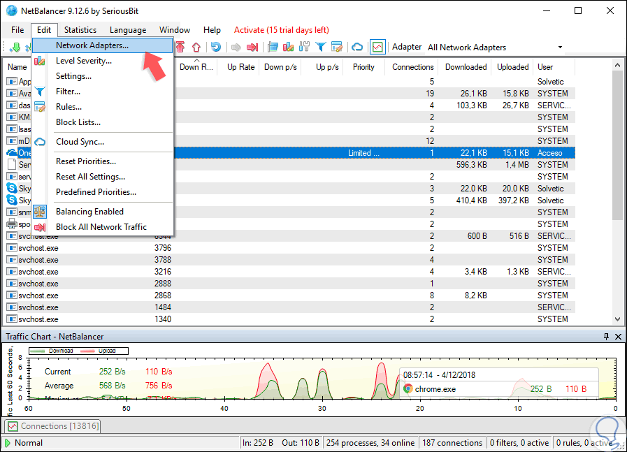 Para eliminar el límite de velocidad debemos cambiar el estado de Prioridad de "Límit" a "Normal". Si la aplicación no puede detectar la tarjeta de red, debemos dar clic en el menú “Edit” y seleccionar la opción Network Adapters: