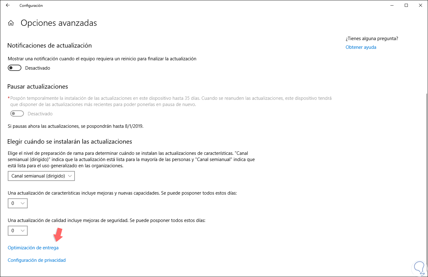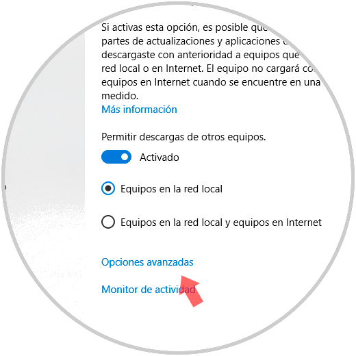 Damos clic en la línea “Opciones avanzadas y en la parte inferior damos clic en la línea “Optimización de entrega”: