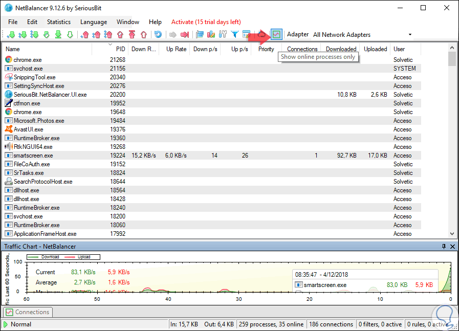 Accederemos a la aplicación y en la ventana principal, vamos a filtrar los procesos que están conectados a Internet, para ello debemos dar clic en el icono "Show online processes only " en la esquina superior derecha: