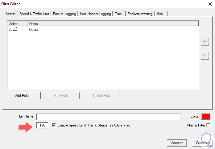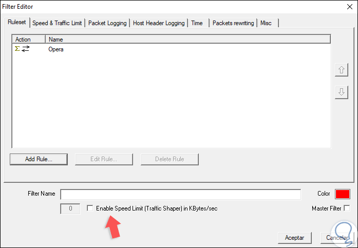 Allí activaremos la casilla “Enable Speed Limit /Traffic Shaper) in KBytes/Sec” y en el campo ingresamos la velocidad deseada para dicha aplicación. Pulsamos en "Aceptar" para guardar los cambios.