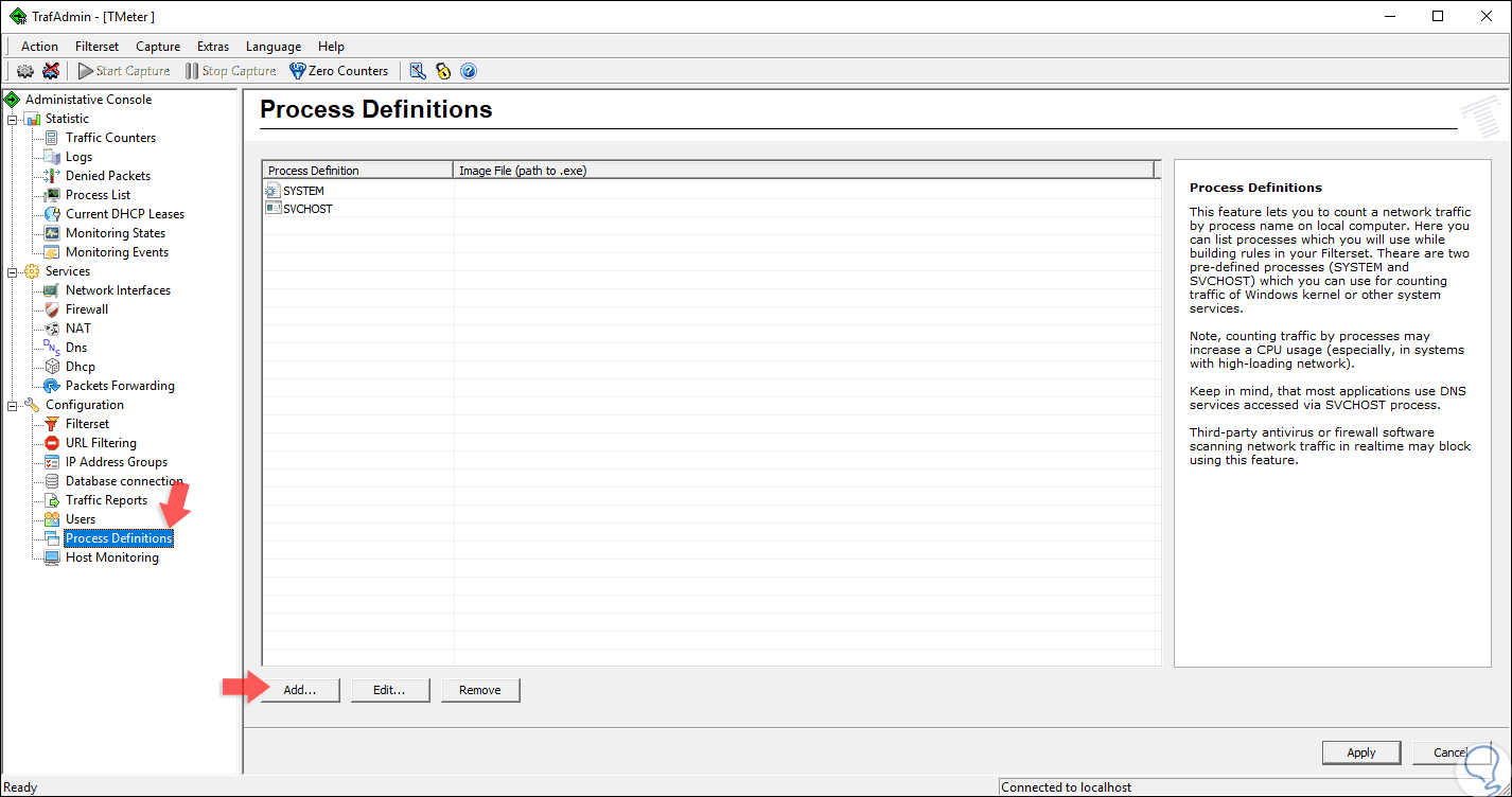 Una vez seleccionada, debemos definir los procesos que deseamos limitar, para esto, damos clic en la sección “Process Definitions” en la barra lateral y luego damos clic en el botón “Add”: