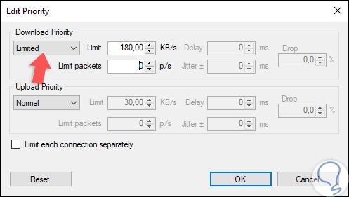 Si se desea limitar con un valor especifico debemos seleccionar la opción “Limit” y en la ventana emergente ingresaremos la velocidad a usar en KB/s. Pulsamos en OK para aplicar los cambios.
