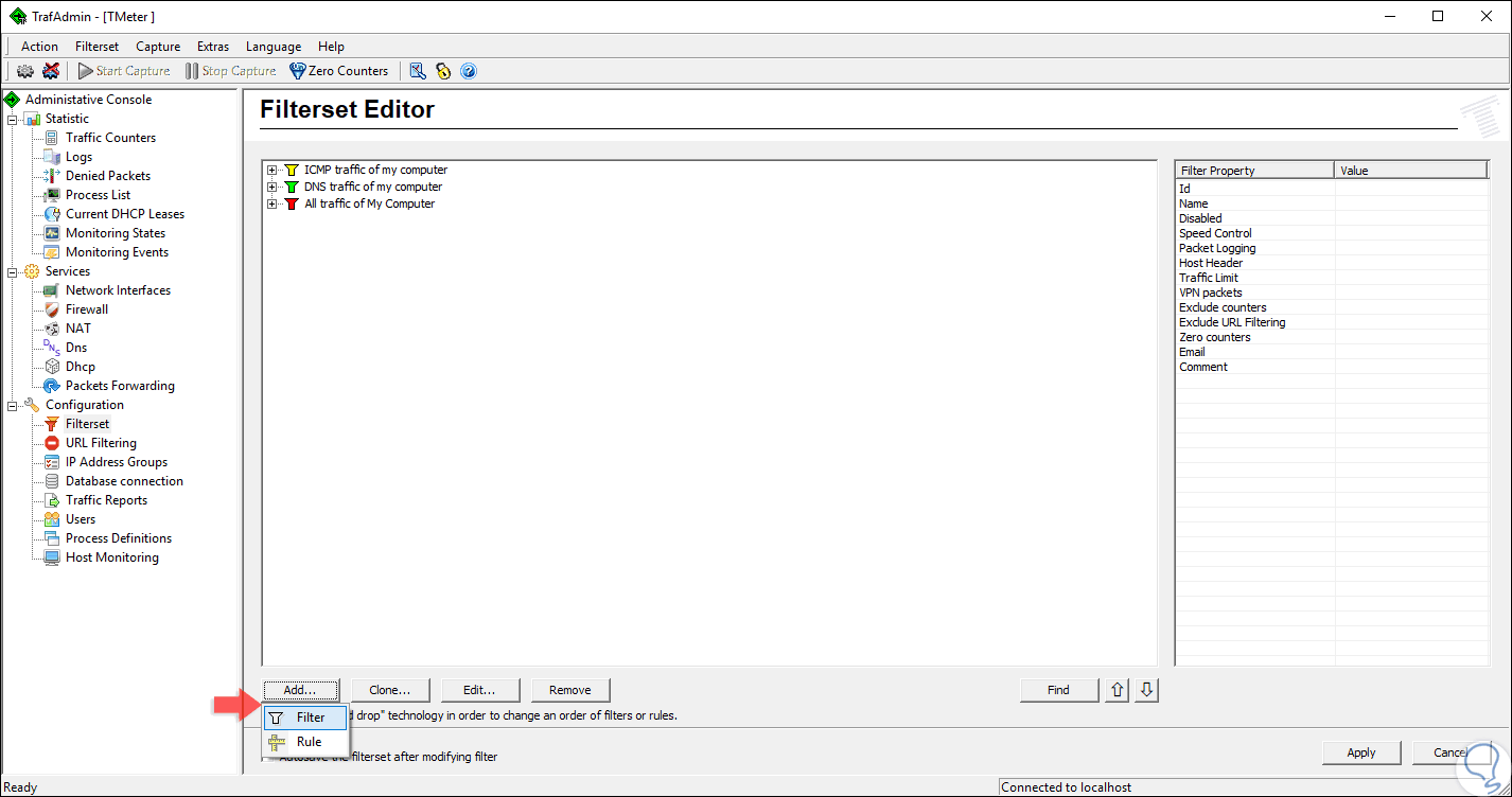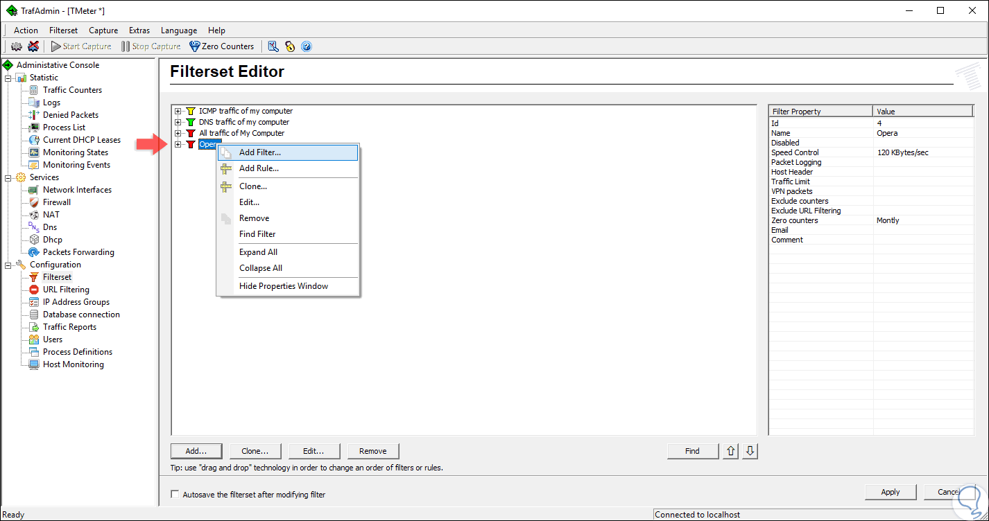 Ahora vamos a crear un filtro que limite el ancho de banda de la aplicación, para esto damos clic en la sección “Filterset” en la barra lateral y luego daremos clic en “Add / Filter”:
