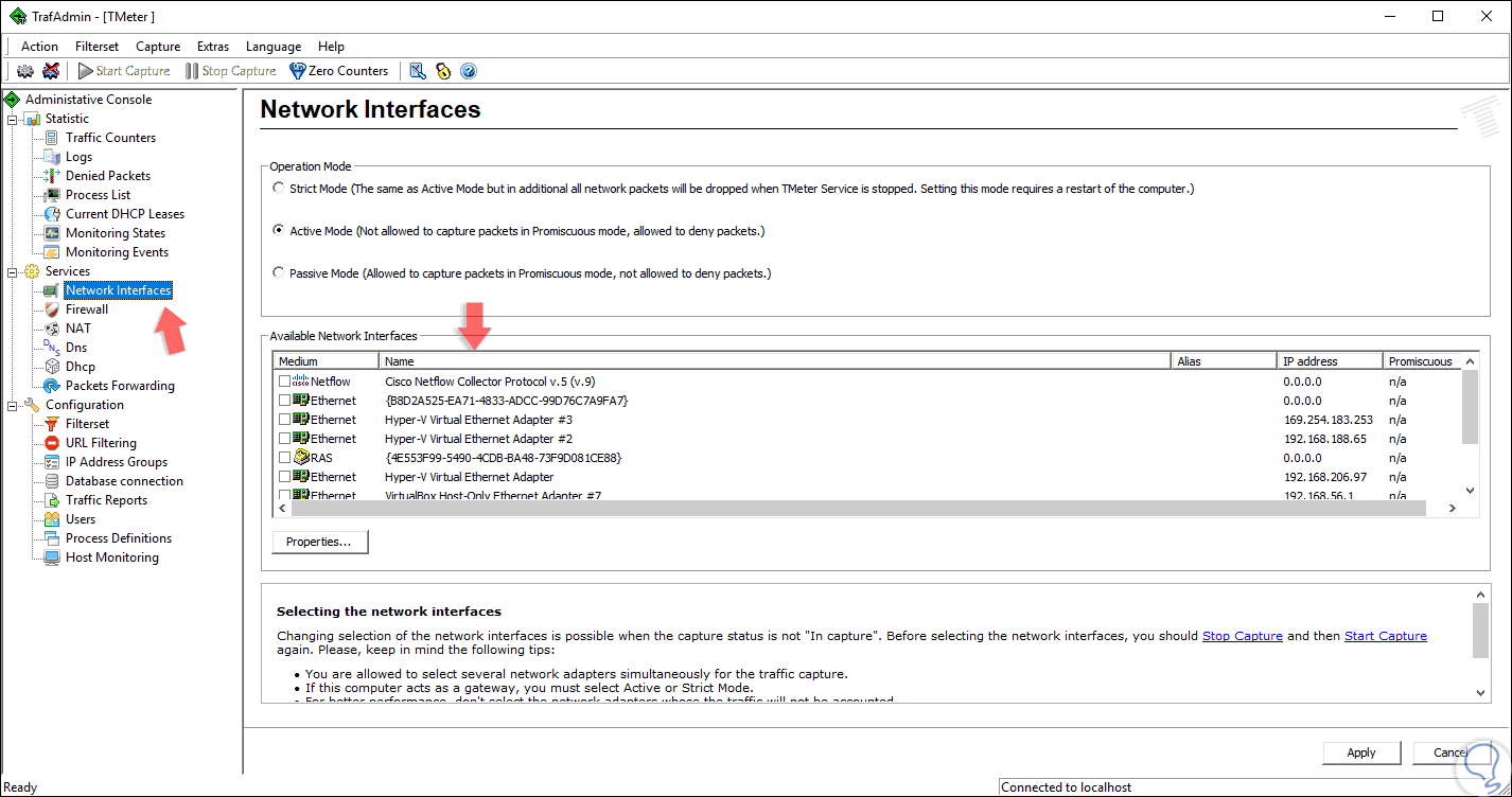En su primer inicio, debemos seleccionar la interfaz de red dando clic en "Network Interfaces" en la barra lateral, y luego marcando la casilla junto a la interfaz de red que usamos:
