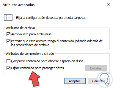 Ahora activaremos la opción de "Cifrar contenido para proteger datos" y guarda los cambios