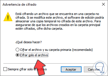 Verás que te pedirá cifrar solo el archivo o también su carpeta contenedora. Lo normal es únicamente este archivo RAR.