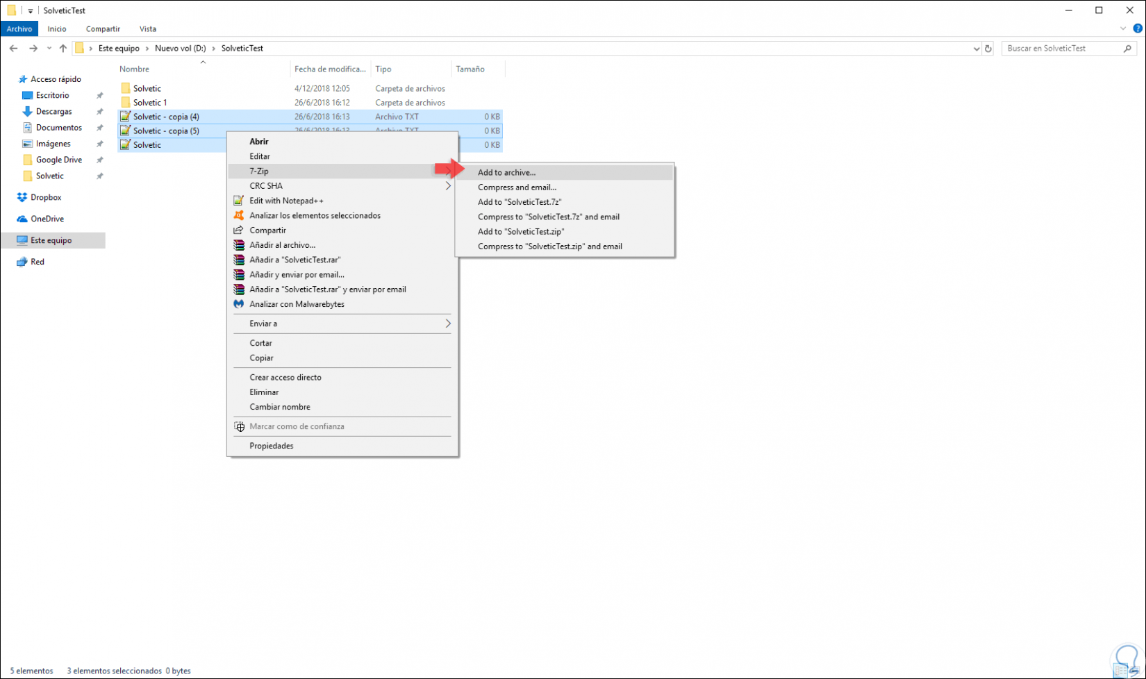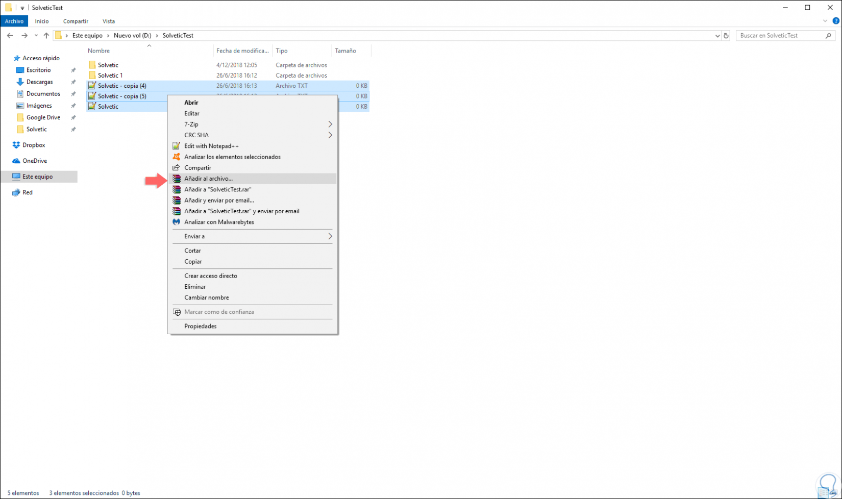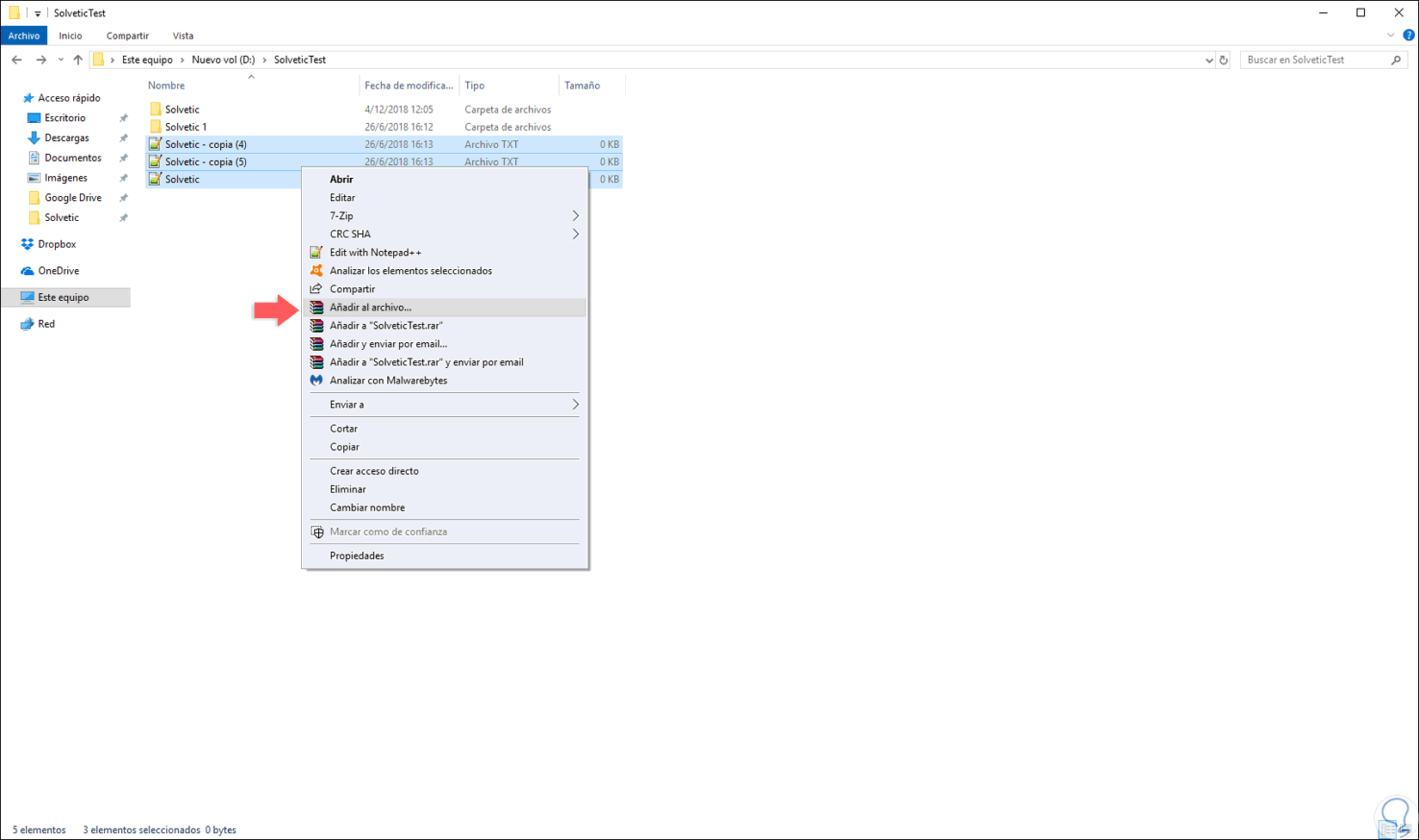 Para este proceso seleccionamos los elementos a comprimir, damos clic derecho sobre ellos y elegimos la opción “Añadir al archivo”: