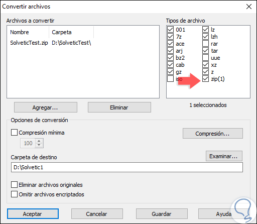 - Confirmamos que la casilla “Zip” está marcada en la sección “Tipos de archivo”.
