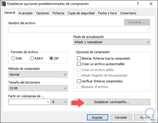 En la ventana desplegada activamos la casilla “RAR” en la sección “Formato de archivo” y pulsamos en el botón “Establecer contraseña”: