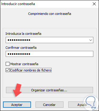 Al pulsar allí ingresaremos la respectiva contraseña y activamos la casilla “Codificar nombres de fichero”: