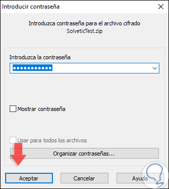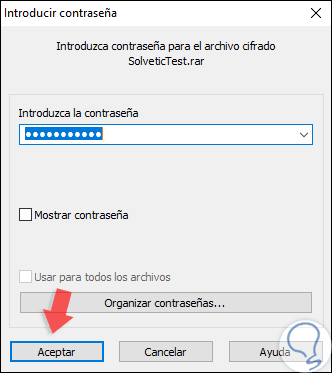 Es necesario que activemos la casilla “Encrypt file names” para que el proceso sea correcto. Como vemos allí podemos realizar una serie de acciones más sobre el archivo a comprimir, definido esto pulsamos en “Ok” para aplicar los cambios. Ahora, cuando se intente acceder a este archivo debemos ingresar la contraseña establecida:
