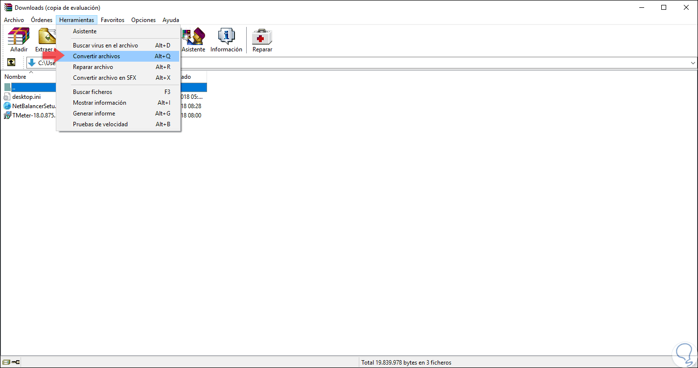 Pulsamos en Aceptar para aplicar los cambios. En caso de que deseemos añadir una contraseña a un archivo ya comprimido, debemos abrir la utilidad WinRAR e ir al menú “Herramientas” y allí seleccionar la opción “Convertir archivos” o bien usar las teclas siguientes: