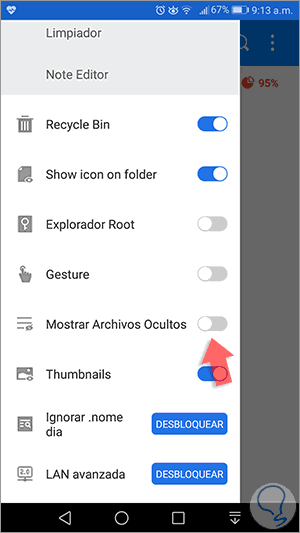 Esto hará que la misma se oculte desde la galería de Android. Si deseamos ver la carpeta oculta, pulsamos en el menú del administrador de archivos y activamos el interruptor “Mostrar archivos ocultos”:
