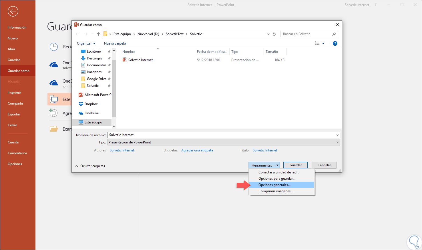 Para este método debemos ir al menú “Archivo” y allí seleccionar la opción “Guardar como”, en la ventana desplegada definiremos la ruta donde se guardará la presentación y debemos pulsar en el campo “Herramientas” y allí seleccionar la línea “Opciones generales”: