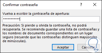 Pulsamos en el botón “Aceptar” para aplicar los cambios y se desplegará una nueva ventana donde confirmamos la contraseña ingresada: